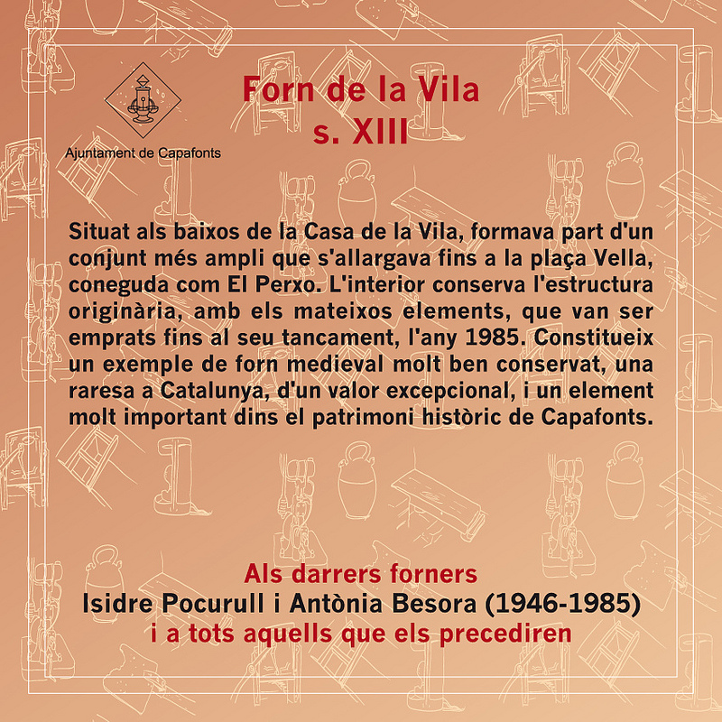 Situat al semi-subterrani de l'ajuntament, el forna de pa de Capafonts data del  del segle XIII i és una de les construccions més importants del poble. El seu estat de conservació és excepcional i actualment està en procés d'habilitació per poder rebre visites.